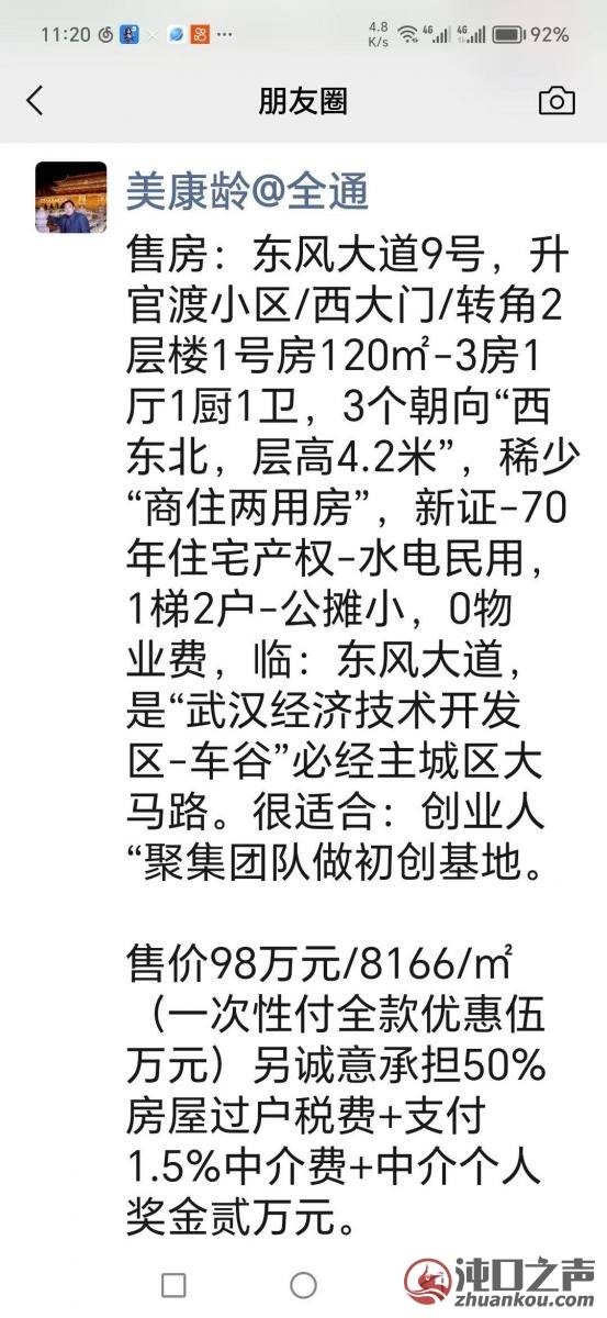 卖房:武汉市东风大道9号,升官渡小区/西大门/转角2层楼1号房120㎡-3房1厅1厨1卫,3个朝向“西东北,层高4.2米”,稀少“商住两用房”,新证-70年住宅产权-水电民用,1梯2户-公摊小,0物业费,临:东风大道,是“武汉经济技术开发区-车谷”必经主城区大马路。很适合:创业人“聚集团队做初创基地。