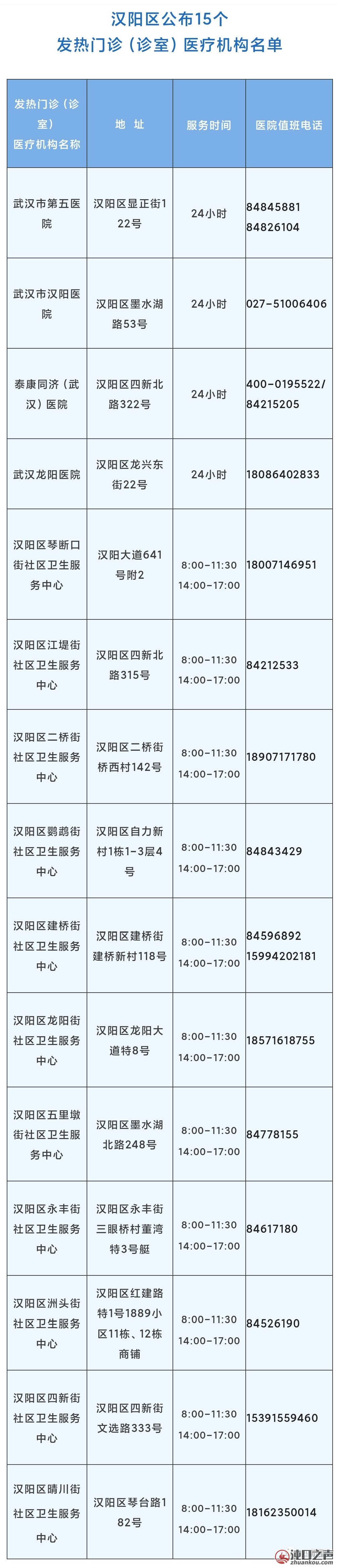 汉阳区15个发热门诊(诊室)医疗机构名单!快快收藏!