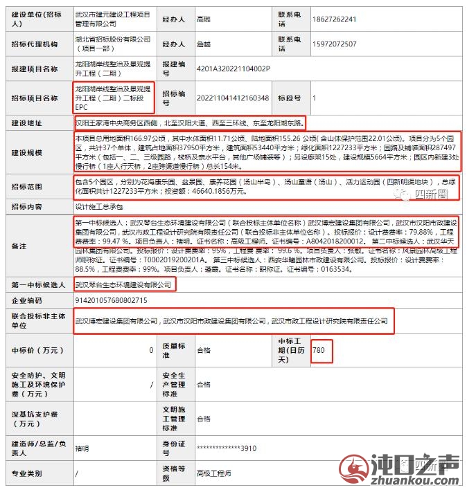 从武汉市公共资源网站获悉,龙阳湖岸线整治及景观提升工程(二期)项目中标结果正在公示。招标项目分两个标段。 招标项目名称:龙阳湖岸线整治及景观提升工程(二期)一标段EPC 建设地址:汉阳区王家湾中央商务区西侧,北至汉阳大道、西至三环线、东至龙阳湖东路。 建设规模:包含5个园区,分别为花海康乐园、盆景园、康养花园(汤山半岛)、汤山童语(汤山)、活力运动园(四新明渠地块)。共计 37 个单体,建筑占地面积 37950 平方米,建筑面积 53440 平方米;园路及铺装面积 287497 平方米(包括一、二、三级园路,栈桥及亲水平台,其他广场铺装等);另设廊架 15 处,建设规模 5664 平方米;园区内新建 3 处慢行桥(1 座人行天桥,2 座跨渠道慢行桥)总长 154 米,主要建设内容包括景观工程中的园建配套工程、道路工程、桥梁工程、给排水工程、电气工程、建筑工程、结构工程等。 房屋建筑工程面积:53440平方米 第一中标候选人:武汉市汉阳市政建设集团有限公司 联合投标非主体单位:武汉博宏建设集团有限公司 中标价:103068.999229万元 中标工期:720天