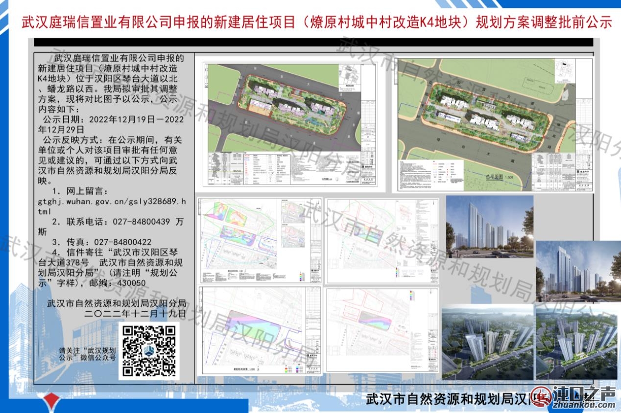 武汉庭瑞信置业有限公司申报的新建居住项目(燎原村城中村改造K4地块)位于琴台大道以北、蟠龙路以西。我局拟审批其规划调整方案,现将对比图予以公示,公示内容如下: