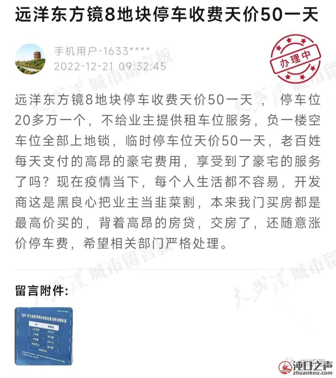 从城市留言板获悉,汉阳区楼盘——远洋东方镜世界观8号地因其临停收费标准,引发业主投诉。