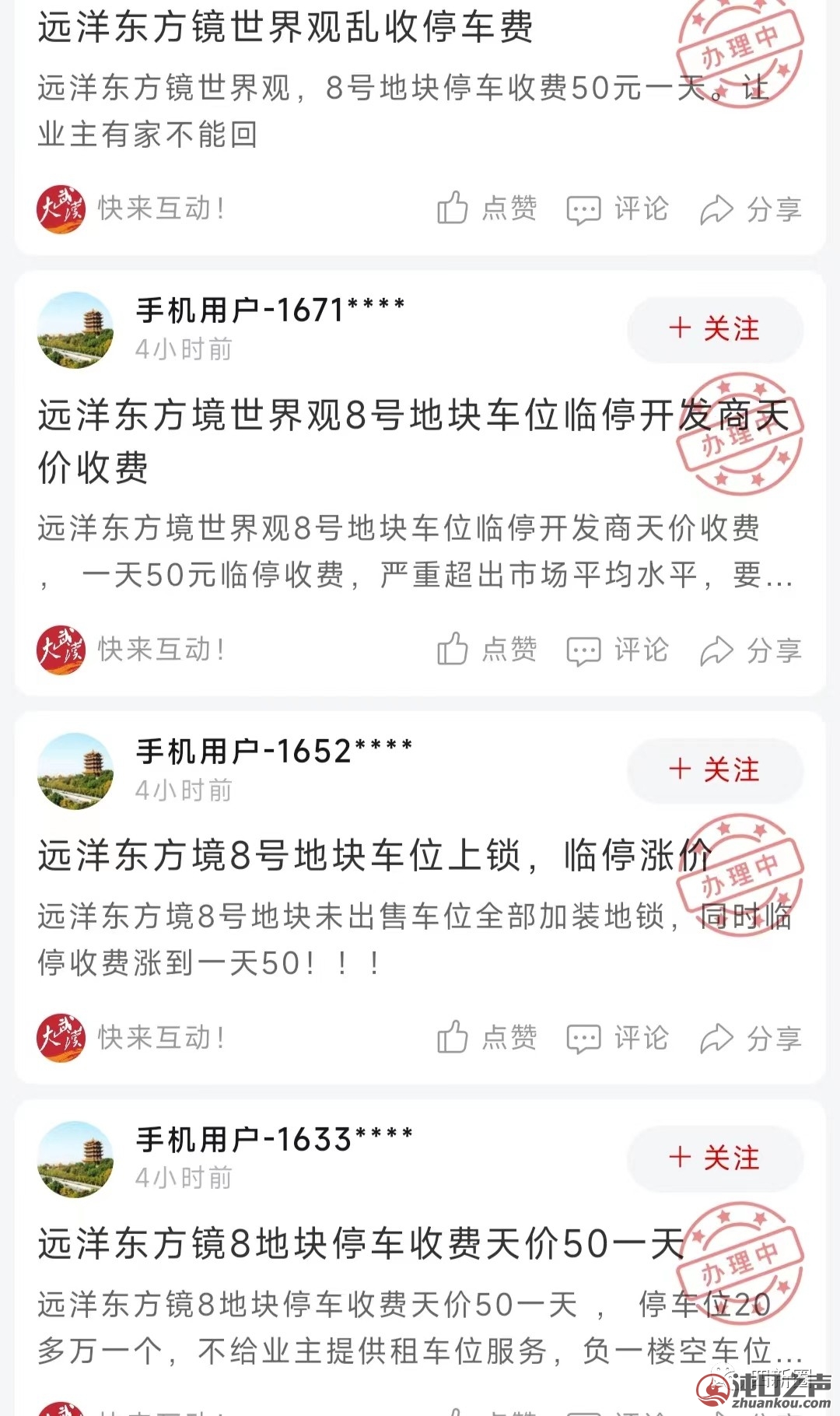 一位业主留言:远洋东方镜8地块停车收费天价50一天 , 停车位20多万一个,不给业主提供租车位服务,负一楼空车位全部上地锁,临时停车位天价50一天,老百姓每天支付的高昂的豪宅费用,享受到了豪宅的服务了吗?现在疫情当下,每个人生活都不容易,开发商这是黑良心把业主当韭菜割,本来我门买房都是最高价买的,背着高昂的房贷,交房了,还随意涨价停车费,希望相关部门严格处理。