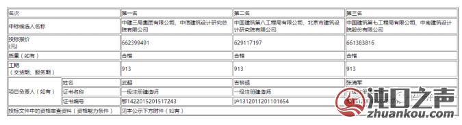 二、评标结果第一中标候选人:中建三局集团有限公司、中信建筑设计研究总院有限公司投标报价:66239.9491万元工期:913天