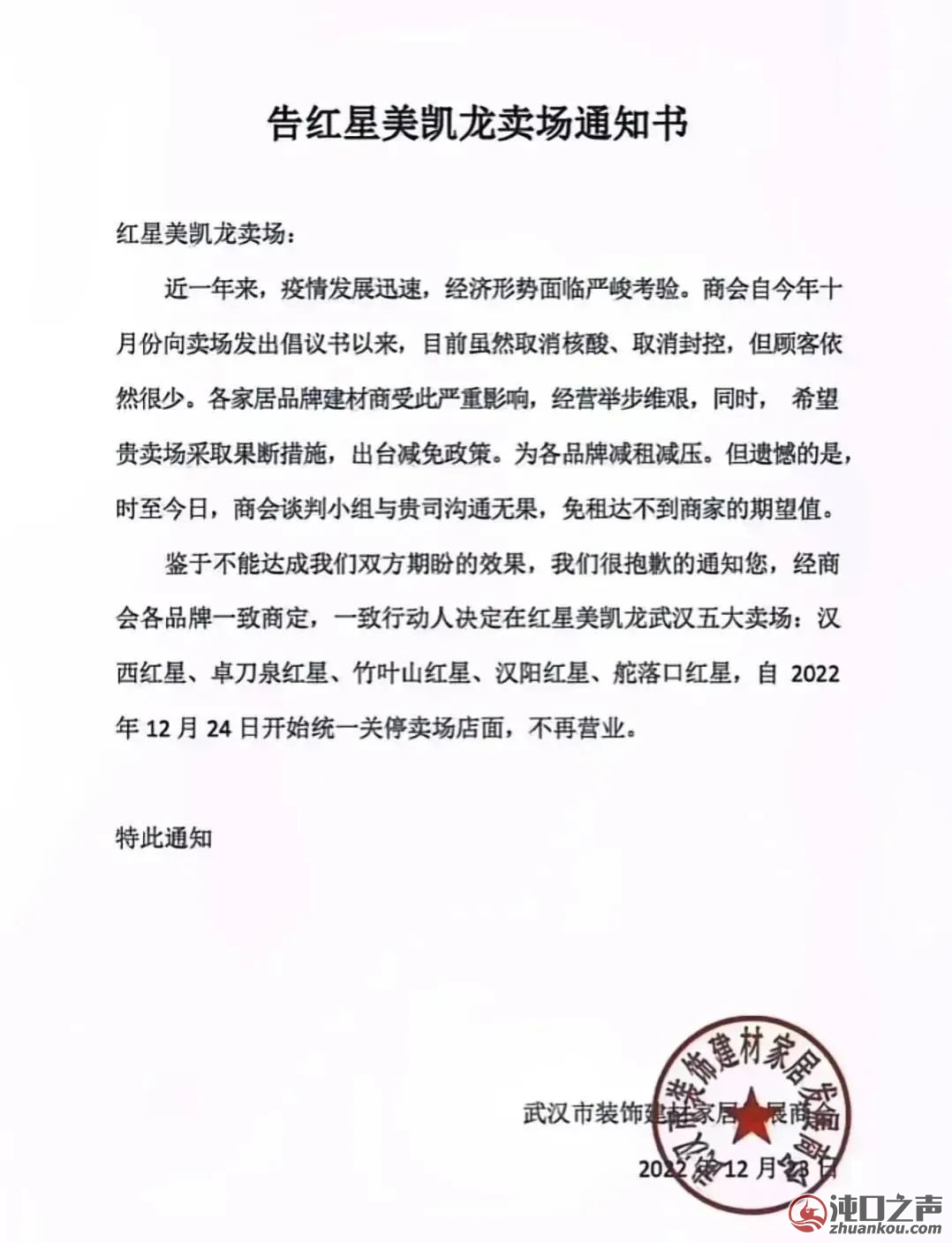 12月23日,武汉市装饰建材家居发展商会发布了一则《告红星美凯龙卖场通知书》,通知内容指出,受疫情影响,各家居品牌建材商经营困难,与红星美凯龙卖场商谈减免政策未达预期,经商会品牌方一致决定,自2022年12月14日起,统一关停在武汉红星美凯龙五大卖场的店面,不再营业。这五家卖场包括:汉西红星、卓刀泉红星、竹叶山红星、汉阳红星、舵落口红星。