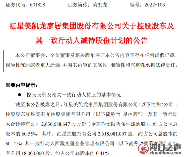 不太好过的不止这些品牌建材商,还有红星美凯龙卖场。据悉,为偿还负债,12月25日,美凯龙发布控股股东及其一致行动人减持股份计划的公告。