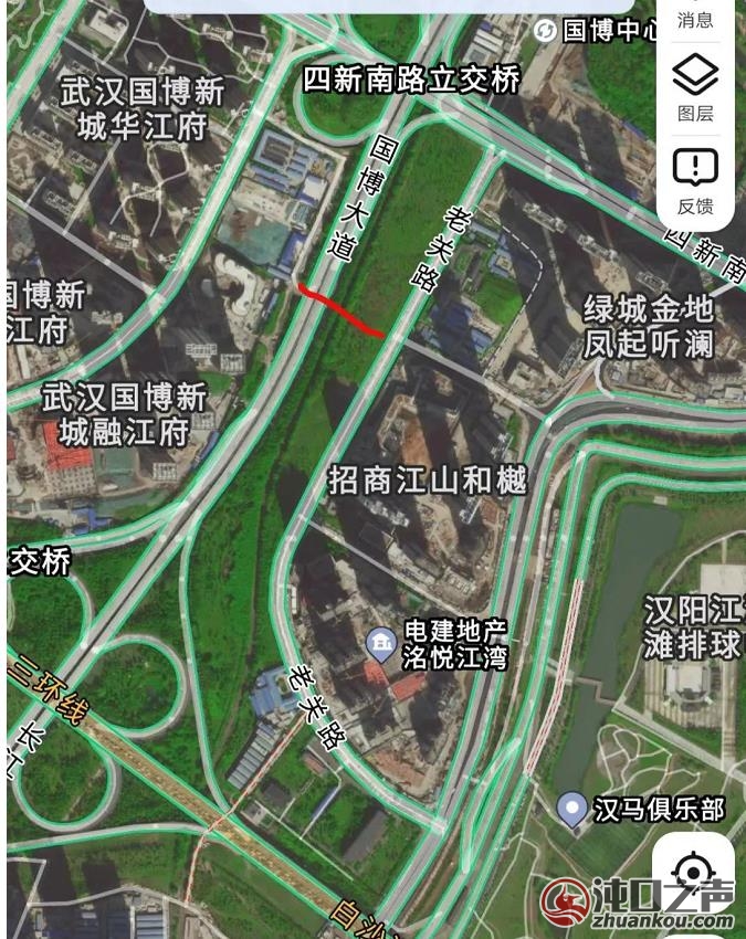 江城大道上人行桥已建几处,国博大道上还仅有一处简易桥,且在住宅稀少的中心南站处,意义作用不大。随着国博大道西边国博D区华江府、融江府、和江府及东北临江板块的绿城、招商、电建等几大楼盘的陆续交付,加上片区几个学校和商业的建设交付,国博大道两侧的居民越来越多,交流越来越频繁,急盼跨国博大道人行桥早日规划动工。 之前官方说此处因受国博大道快速路、货运铁路及底下地铁线网的影响和制约,人行桥无法设计施工,其实这都不是困难,是借口,长江大桥都能建,何况一个人行桥?大不了将人行桥建长点嘛,直接连接到老关路,完全避开快速路、铁路及地铁线网,如下图。
