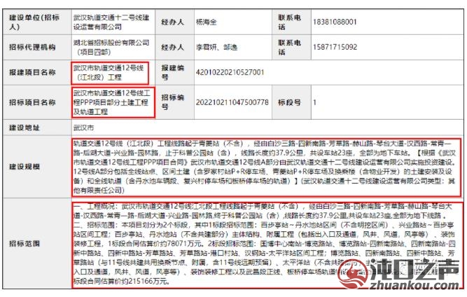 一、工程概况:武汉市轨道交通12号线江北段工程线路起于青菱站(不含),经由白沙三路-四新南路-芳草路-赫山路-琴台大道-汉西路-常青一路-后湖大道-兴业路-园林路,终于科普公园站(含),线路长度约37.9公里,共设车站23座,全部为地下线路 。 二、招标范围:本项目划分为2个标段。 其中1标段招标范围:百步亭站~丹水池站区间(不含明挖区间)、兴业路站~百步亭站区间工程;百步亭站、丹水池站(不含共建部分)主体结构、附属工程(包括出入口及通道,风井、风道,风亭等) 、装饰装修工程,1标段合同估算价约78071万元。 中国铁建大桥工程局集团有限公司联合中国铁建投资集团有限公司以62726.6666万元的价格中标该项目1标段,中标工期1068天。 2标段招标范围:国博中心南站-博览路站、博览路站-四新南路站、四新南路站-四新中路站、四新中路站-芳草路站、芳草路站-港口村站、汉钢站-太平洋站区间工程;博览路站、四新南路站、四新中路站、芳草路站(与11号线共建共用换乘节点、附属,含11号线远期预留)、太平洋站(不含共建部分)主体结构、附属工程(包括出入口及通道,风井、风道,风亭等)、装饰装修工程以及武昌段正线、板桥停车场轨道铺设,道岔道床铺设及其附属工程等, 2标段合同估算价约215166万元。 中铁五局集团有限公司联合中铁大桥局集团有限公司 、中铁二局集团有限公司、中铁开发投资集团有限公司 、 中铁一局集团有限公司以220022.6314万元的价格中标该项目2标段,中标工期1075天。 |