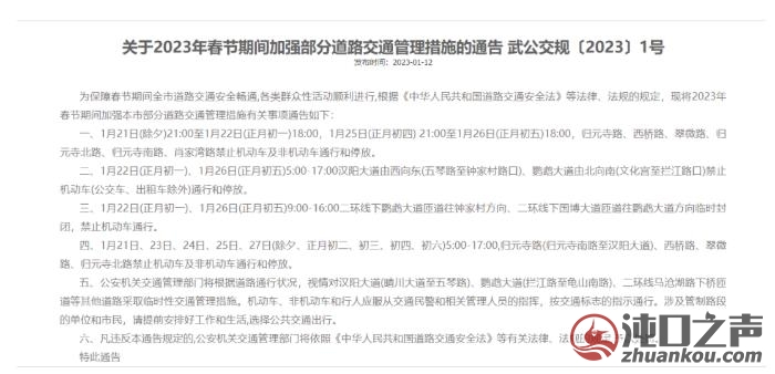 关于2023年春节期间加强汉阳区部分道路交通管控的通告