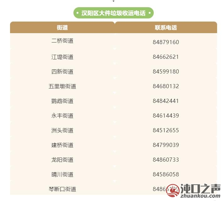 家里想换新家具但旧家具却不知道送到哪里去废旧的床垫、桌椅、沙发等“大家伙”家里放不下、小区没地方扔大件垃圾处置难问题 这些大件垃圾汉阳可以免费预约上门收运啦! 一个电话免费上门服务 为了解决这一难题,武汉市将每月最后一个周五定为“大件垃圾”专项回收日。汉阳区也开通免费热线,居民可以拨打所属街道的收运电话进行预约,提前将大件垃圾搬至小区指定集中暂存点,环卫人员将于回收日当天统一收运。 // 目前,汉阳区11个街道已经实现大件垃圾回收全覆盖。 如果您有收运大件垃圾的需要可以拨打自己所属街道的收运电话进行预约哦~↓