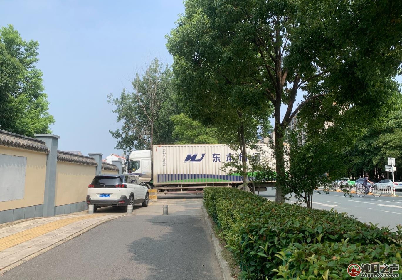 汉阳四新路边有大货车把人行道给堵死