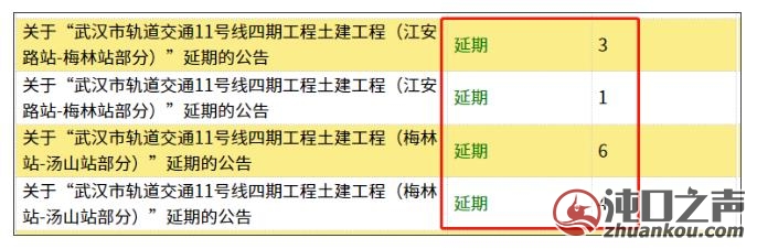 从武汉市公共资源网站获悉,武汉市轨道交通11号线四期工程土建工程(江安路站-梅林站部分)1标段、3标段和武汉市轨道交通11号线四期工程土建工程(梅林站-汤山站部分)4标段、6标段招标延期。