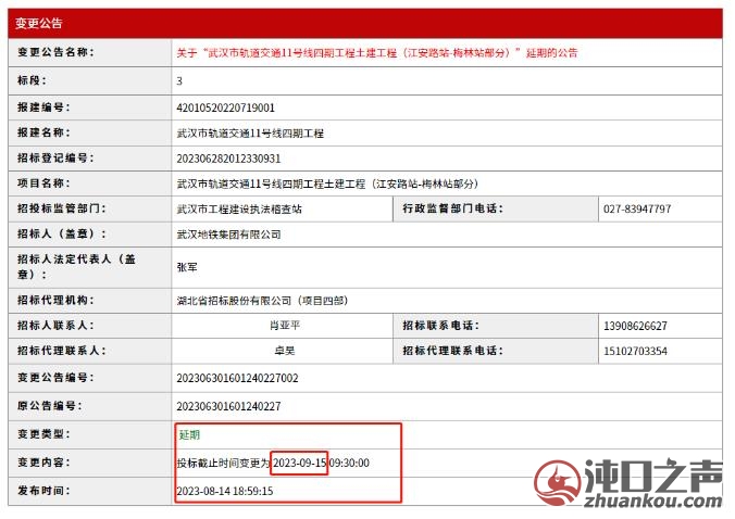 武汉市轨道交通11号线四期工程土建工程(江安路站-梅林站部分) 第一标段:江安路站-江国路站(盾构区间)、江国路站(地下车站),共计1站1区间的土建工程; 第三标段:国博中心北站(地下车站)、国博中心北站-梅林站(盾构区间),共计1站1区间的土建工程。 武汉市轨道交通11号线四期工程土建工程(梅林站-汤山站部分) 第四标段:梅林站(地下车站)、梅林站-芳草路站(盾构区间)、芳草路站-四新大道站(盾构区间)、四新大道站(地下车站),共计2站2区间的土建工程; 第六标段:四新大道站-汤山站(盾构区间)、汤山站(地下车站)、汤山车辆段出入线(盾构+U型槽+明挖暗埋),共计1站1区间1出入线的土建工程。 根据变更公告的内容,本次变更是将招标时间延长到9月15日,原本截止时间是7月12日。