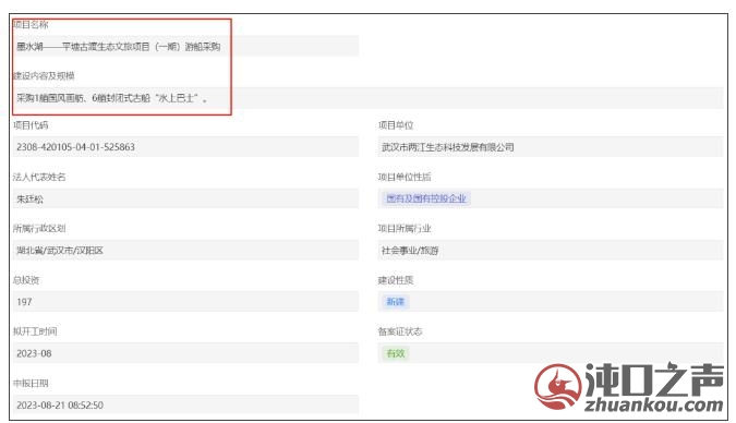 今日,武汉市两江生态科技发展有限公司申请墨水湖——平塘古渡生态文旅项目(一期)游船采购项目通过备案,该项目计划采购1艏国风画舫、6艏封闭式古船“水上巴士”。