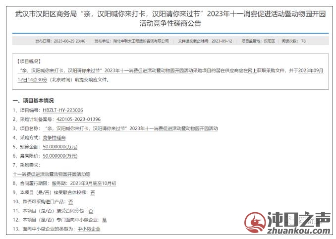 从湖北政府采购网站获悉,武汉市汉阳区商务局“亲,汉阳喊你来打卡,汉阳请你来过节”2023年十一消费促进活动暨动物园开园活动竞争性磋商公告发布。
