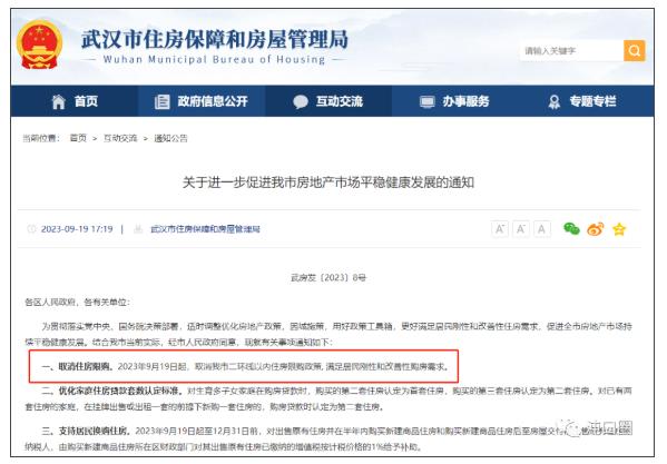 9月19日,武汉市住房保障和房屋管理局发布《关于进一步促进我市房地产市场平稳健康发展的通知》,宣布武汉市全面解开限购,全文如下:
