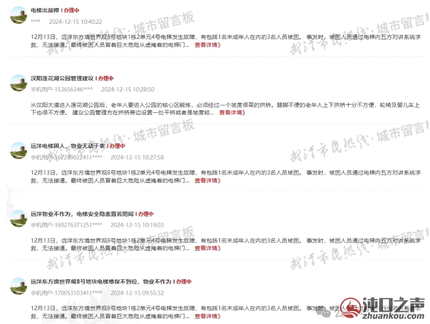 近日,城市留言板上有多位居民投诉,远洋东方境世界观8号地块一楼栋电梯发生故障,3位业主被困,电梯内对讲呼救无人回应,业主自救爬出故障电梯,事后物业处理方式却。。。。。 “12月13日,远洋东方境世界观8号地块1栋2单元4号电梯发生故障,有包括1名未成年人在内的3名人员被困。 事发时,被困人员通过电梯内五方对讲系统求救,无法接通。最终被困人员冒着巨大危险从虚掩着的电梯门自行爬出。 事发后,物业不主动道歉安抚,不配合查看监控视频设置莫须有的障碍(要求业主报警查看监控),不公开说明事故原因,事故发生后24小时之后一栋二单元四部电梯五方对讲求救按钮依旧处于无法接通状态。 诉求: 1.物业公开说明电梯困人事件原因、处理措施及相关监控视频。 2.物业向被困人员道歉并做好安抚工作。 3.物业公示电梯维保记录。 4.物业科及特种设备管理部门对物业进行行政处罚。” |