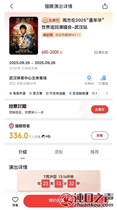 目前,猫眼平台显示有336万+人想观看本次演出,热度真的非常高。周杰伦当之无愧的乐坛巨星!他以无与伦比的音乐魅力,横扫80后、90后、00后三代人,收获无数歌迷的狂热追捧! 周杰伦的演唱会是猫眼平台独家销售的,大家别去错平台了。