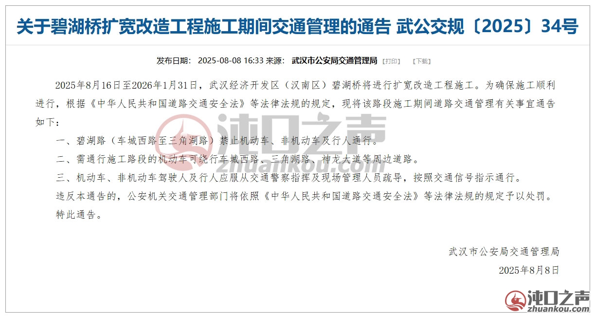 近日,从武汉市公安交通管理局了解到:2025年8月16日至2026年1月31日,因碧湖路桥扩宽改造工程施工,碧湖路(车城西路—三角湖路)禁止机动车、非机动车及行人通行。