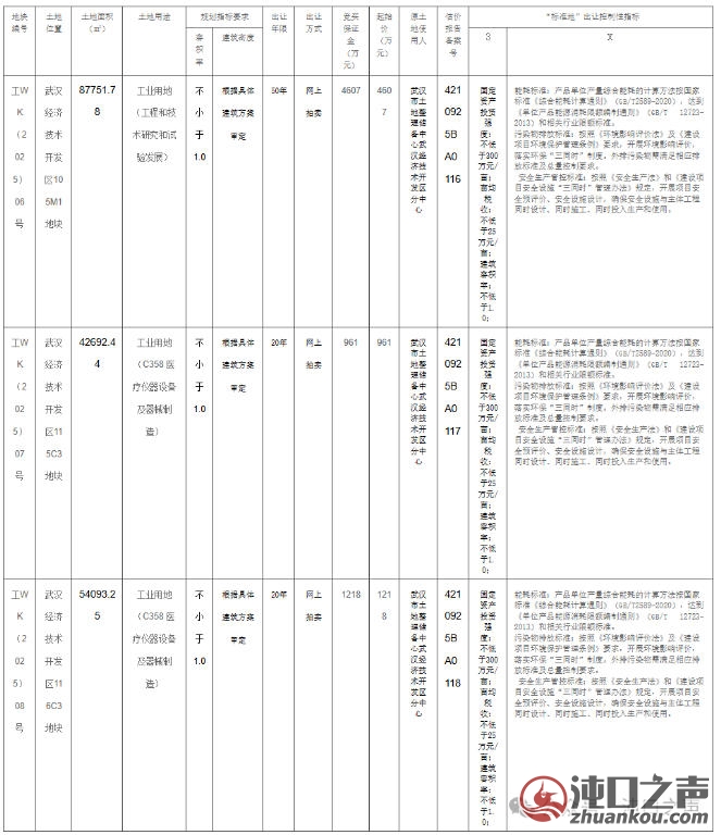 二、中华人民共和国境内外的法人、自然人和其他组织,除因拖欠土地成交价款等行为被纳入土地市场失信行为记录档案或国家法律法规另有规定外,均可申请参加竞买。 三、竞买企业股东不得违规对其提供借款、转贷、担保或其他相关融资便利等;购地资金不得直接或间接使用金融机构各类融资资金,不得使用其他自然人、法人、非法人组织的借款。竞买人必须对购地资金来源进行说明,提供相应证明并对上述要求作出承诺。后期一旦查实发现有问题的,将取消竞得资格、依法收回土地、没收竞买保证金,并纳入土地市场黑名单,限制其1年内参与我市土地竞买。 四、本次拍卖出让地块申请时间为自本公告发布之日起至2025年9月22日17时整止,交纳竞买保证金截止时间为2025年9月22日17时整。 本次竞买活动的币种为人民币,不接受外币竞买。 武汉经济技术开发区(汉南区)自然资源和城乡建设局 2025年9月1日 地块编号:工WK(2025)06号,地块位置:经开区105M1地块,土地面积:87751㎡,土地用途:工业用地(工程和技术研究和试验发展),起拍价:4607万元。 地块编号:工WK(2025)07号,地块位置:经开区115C3地块,土地面积:42692㎡,土地用途:工业用地(C358 医疗仪器设备及器械制造),土地有限期:20年,起拍价:961万元。 地块编号:工WK(2025)08号,地块位置:经开区116C3地块,土地面积:54093㎡,土地用途:工业用地(C358 医疗仪器设备及器械制造),土地有限期:20年,起拍价:1218万元。 本次出让经开区115C3地块和经开区116C3地块,位于军山新城孔明湖畔,将打造军山医工产业园,土地有限期仅20年。