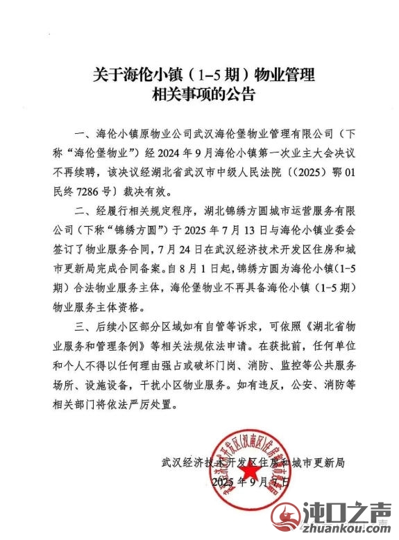 根据武汉经开区住房和城市更新局公告,海伦小镇原物业公司武汉海伦堡物业管理有限公司(下称“海伦堡物业”)经2024年9月海伦小镇第一次业主大会决议不再续聘。湖北锦绣方圆城市运营服务有限公司(下称“锦绣方圆”)于 2025年7月13日与海伦小镇业委会签订了物业服务合同,自8月1日起,锦绣方圆为海伦小镇(1-5期)合法物业服务主体,海伦堡物业不再具备海伦小镇(1-5期)物业服务主体资格。