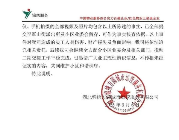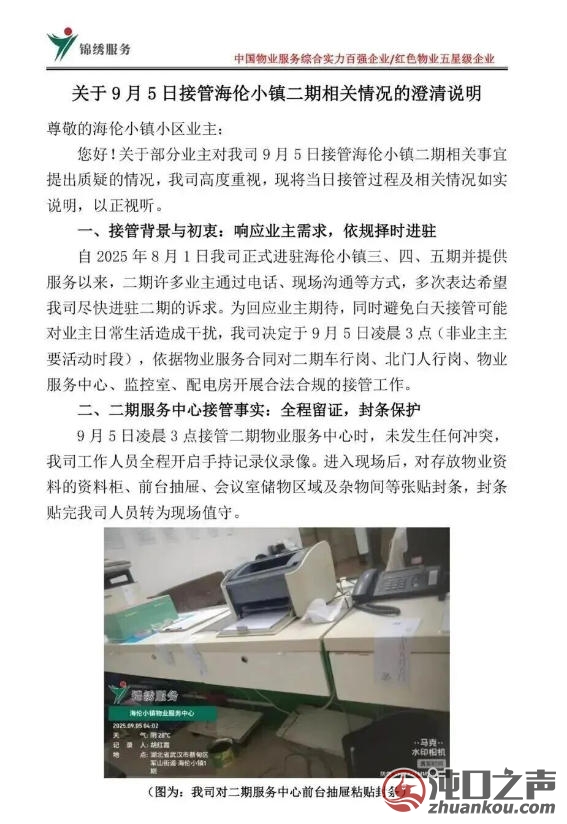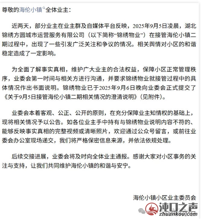 有海伦小镇的业主反映,2025年9月5日凌晨,锦绣方圆物业在接管过程中遇到突发事件,业委会本着客观、公正、公开的原则,在充分保障业主知情权的基础上,现将相关情况予以公告。