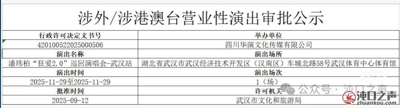 近日,潘玮柏“狂爱2.0”巡回演唱会-武汉站演唱会正式获批,演出时间:2025年11月29日,演出场所:武汉体育中心体育馆。