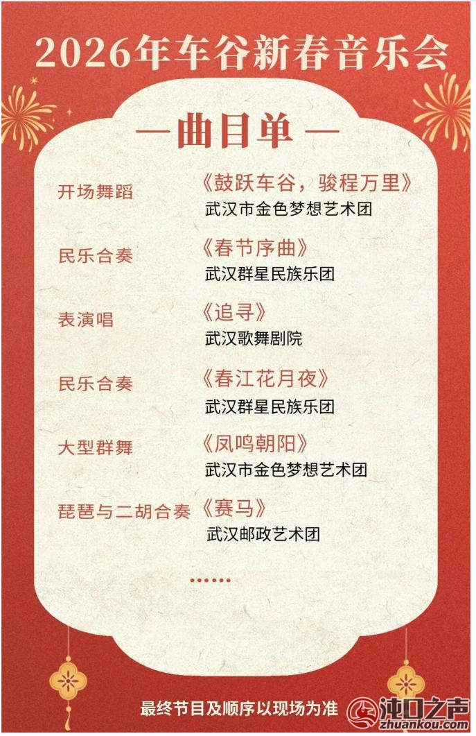 这场“嘉年华”集逛、吃、玩、购、赏于一体,用满满的生活气息和诚意福利,邀您共赴新春之约。 2026车谷新春音乐会上,武汉群星民族乐团、武汉邮政艺术团等知名院团将带来歌舞、民乐、戏曲、杂技等精彩节目,堪称家门口的“马年春晚”。音乐会票价低至9.9元起,“大麦”搜索即可轻松购票,席位有限,先到先得。